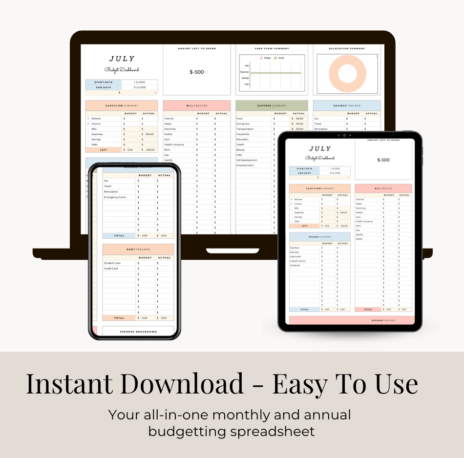 Managing your finances shouldn’t feel overwhelming. Our Pretty Organised Budget Spreadsheet was designed to help you feel clear, confident, and in control - even if budgeting has never worked for you before.