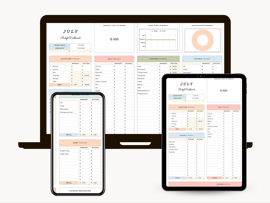 With an easy-to-use layout and beautifully organised sections, our spreadsheet gives you a complete snapshot of your money in one place. Track what’s coming in, what’s going out, and exactly where your money is working for you - all without complicated formulas or confusing systems.